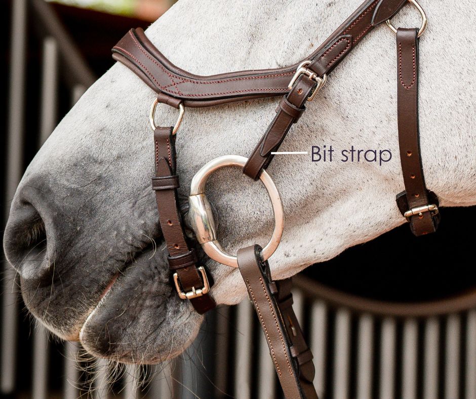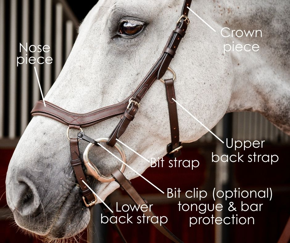 Correct positioning of the nose piece is very important. The cheek pieces should pass just below the horse's protruding cheekbones. To confirm you have the right position over the nose, gently put your fingers on either side of the nostrils and you will be able to locate where soft nostril cavity meets the fragile ends of the nasal bones. The front nosepiece should not be below this point, it should sit 2 finger widths above where the soft nasal cavity ends. Next, use the leather bit straps (shorten now if required) or plastic bit clips, to fit your bit at the normal height.