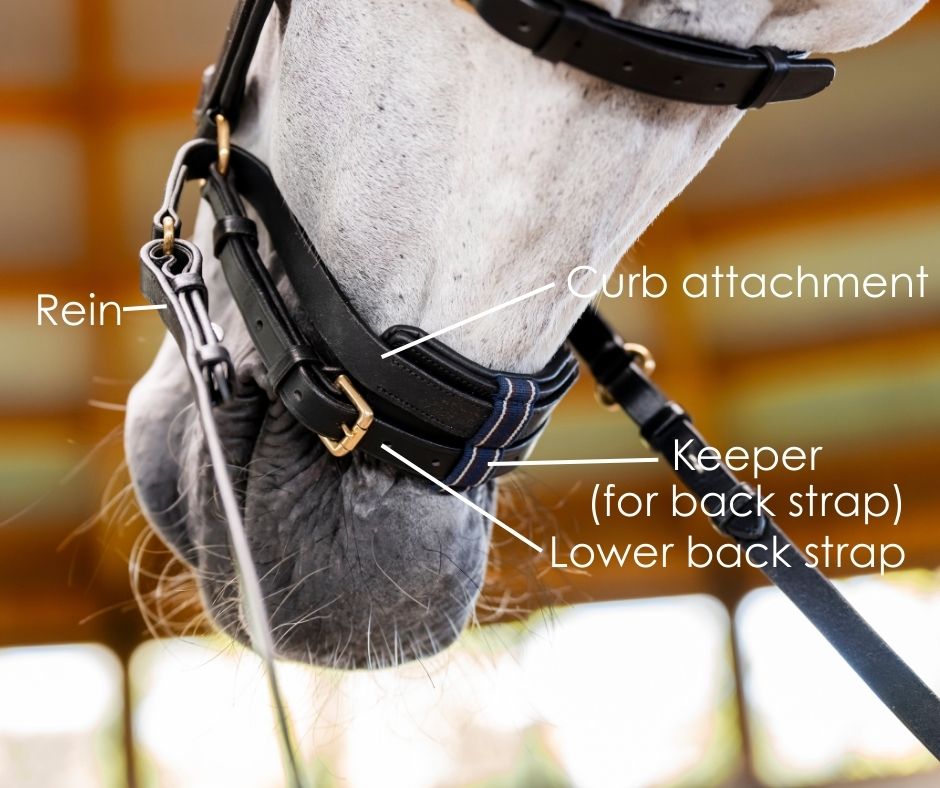 Medium - Add the curb attachment by fitting it under the lower back strap, like a curb chain. When doing this, the lower back strap will slide 'through' the fabric keeper of the curb groove attachment. Then bring the side straps of this attachment up through the side rings of the MultiBridle, attaching the reins to the ends of these side straps.