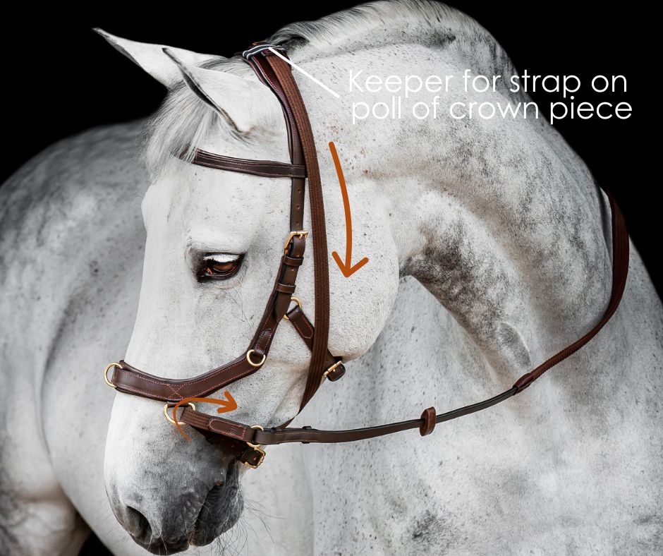 Strong - Take the long fabric webbing strap and bring it through the keeper located at the top of the crown piece. Centre this strap, then cross it diagonally under the jaw, in front of the cheeks, and bring it through (under & out) the bridle's nose piece side rings. Attach the reins to the rings on the ends of this long webbing strap.
