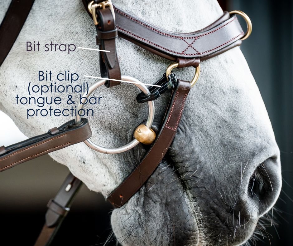 Fitting the Tongue & Bar Protector (optional) The bit clips can be used in conjunction with a fitted bit. This provides you with a unique tongue and bar protection system. If a rider gets left behind, or a horse and rider pull against each other, the clips will shift the extra pressure to the nose rather than on to the tongue or the very narrow bars of the mouth.